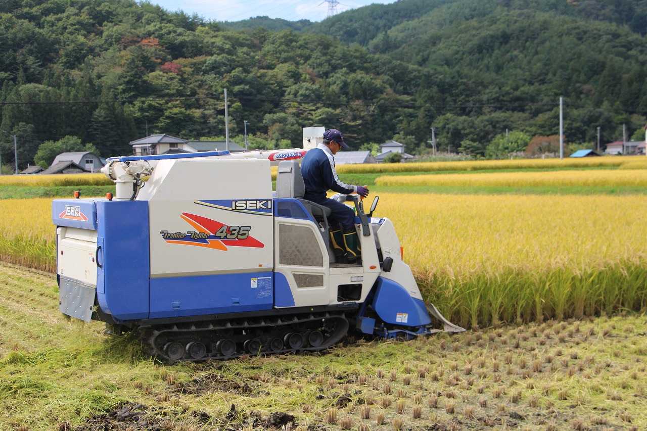 川内村、ただ今、稲刈り、どの地区でもやっています。一人のひとを、のぞいてコンバインでの稲刈りです。