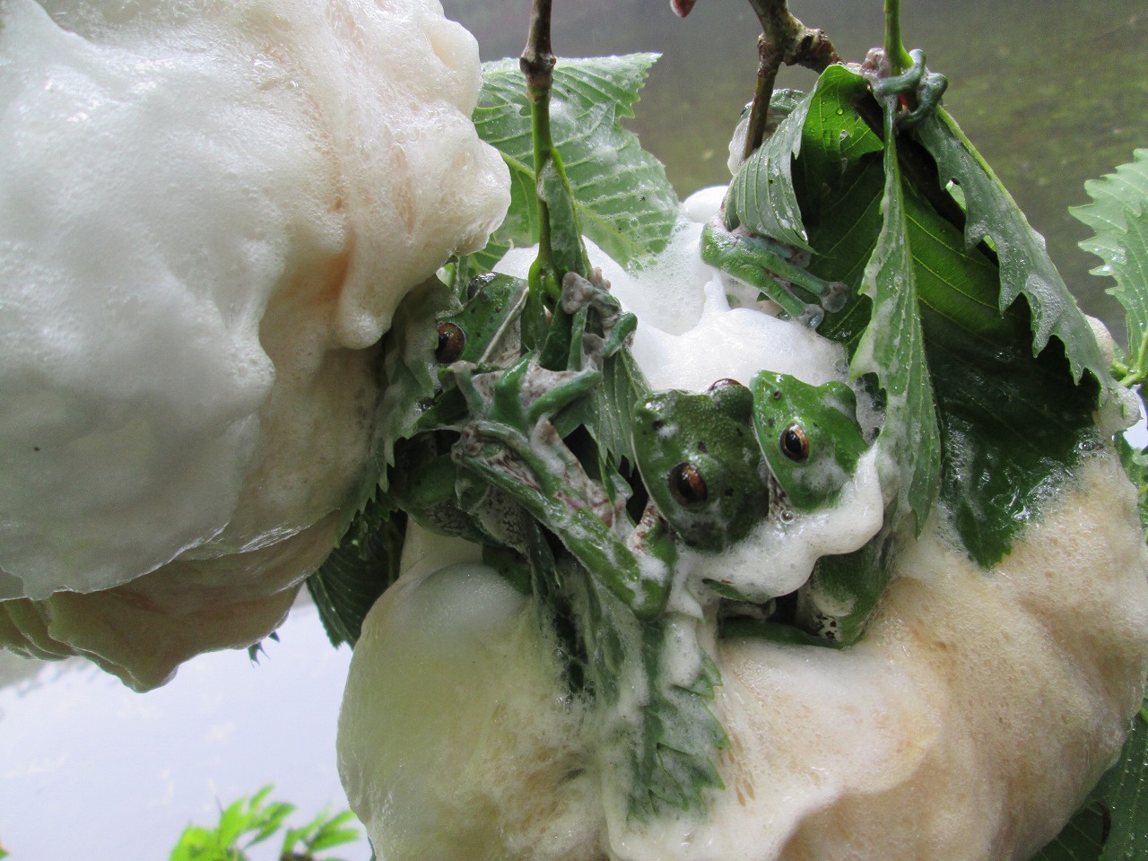 右の写真は、月曜日にモリアオガエルが固まって産卵をしていた場所の卵です。写真ではつたわりずらいですが、とても大きな卵となっており、木の枝も大きくしなっていました。