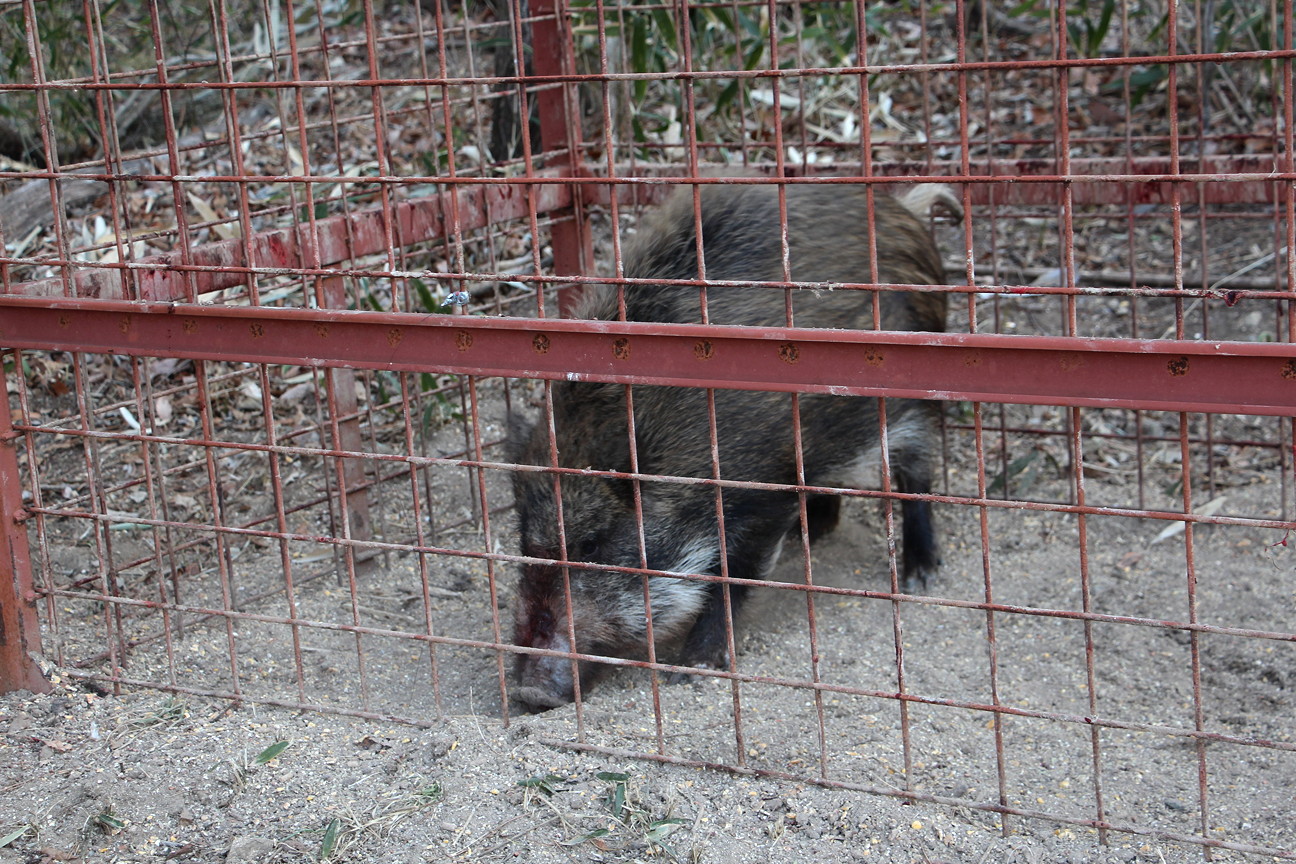道を歩いていくと、赤い小屋がありました。中で、なにかが動いている。おおっと、これはイノシシさんではありませんか。実は本日は、イノシシがつかまっているという情報を聞きつけて、さっそく出かけていったわけです。